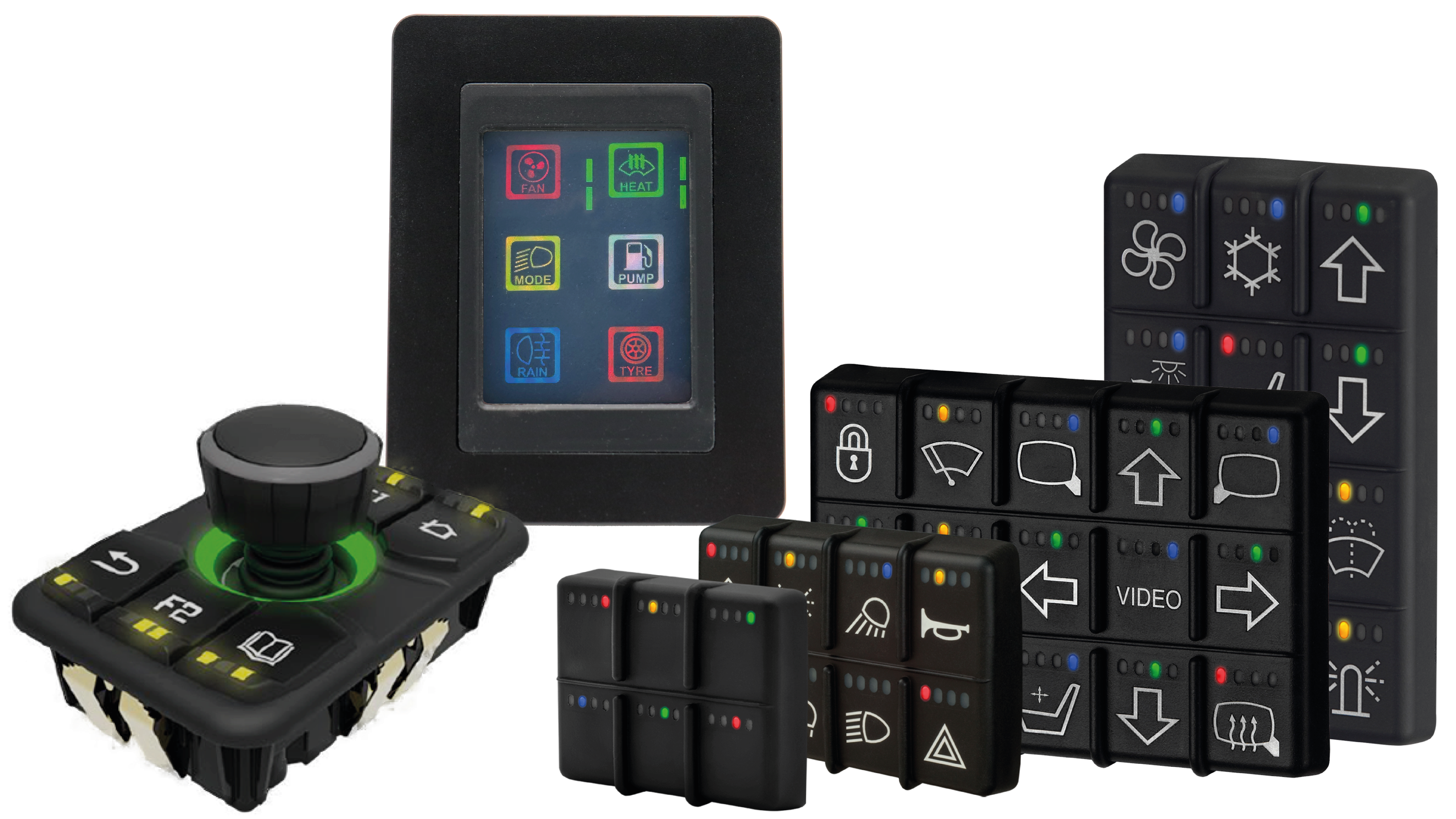 Die SwitchModules sind mit ihrem modularen Aufbau und ihrer Ausrichtung auf den on-board Bereich perfekt für den Einbau als Schaltmodule in Nutzfahrzeugen geeignet. Die KeypadModules sind Schaltmodule mit SAE J1939 Schnittstelle und in verschiedenen Varianten verfügbar (6, 8, 12 oder 15 Tasten).